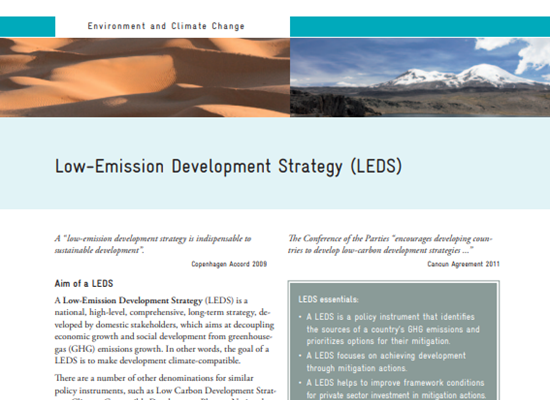 The document is about Low-Emission Development Strategies (LEDS), which are national strategies aiming to decouple economic growth and social development from greenhouse gas emissions growth. LEDS integrate mitigation and adaptation aspects, analyze baseline emissions, identify mitigation opportunities, set targets, define policies, assess financial needs, and involve stakeholders.